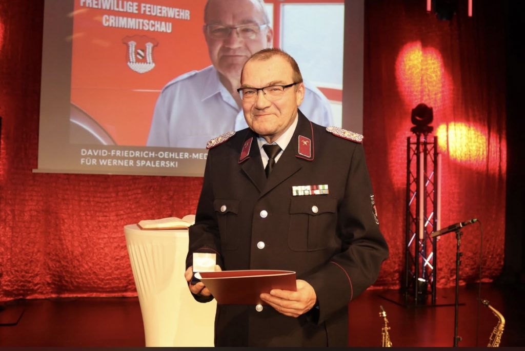 Am Mittwoch, den 21. Januar 2026, wurde der ehemalige Gemeindewehrleiter Werner Spalerski, anlässlich des Neujahrsempfang, für seine Verdienste mit der David-Friedrich-Oehler-Medaille ausgezeichnet. Kamerad Spalerski begann 1979 seine Karriere in der Freiwilligen Feuerwehr Crimmitschau. Seit 1990 übte er die Funktion des Gemeindewehrleiters, mit heute 10 Ortsfeuerwehren aus.